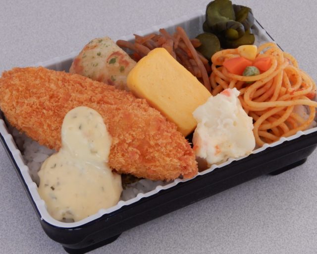 『のり弁風』 メインに白身魚フライとちくわ磯辺天ぷら、副菜にきんぴらごぼう、ナポリタン、ポテトサラダ、厚焼き玉子が入ります。 この日はのりおかかご飯です。おかずをライスの上にのせると『のり弁』が完成いたします。のせて良し、そのままでも良いメニューとなっております。 |
