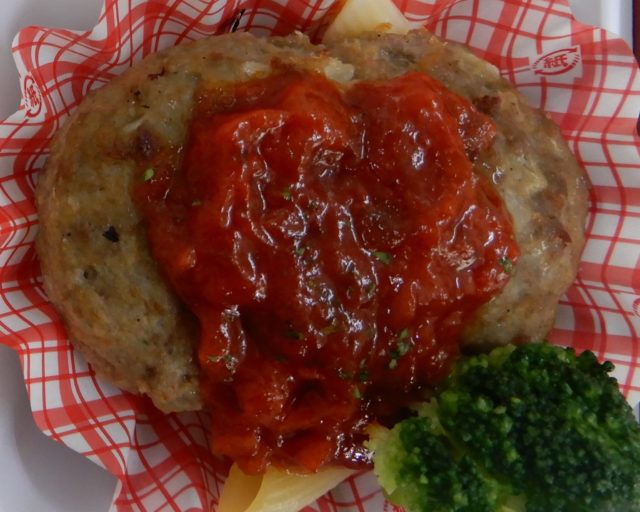 『ハンバーグバジルトマトソース』 爽やかなバジルの風味を加えたトマトソースが食欲をそそるメニューとなっております。 今回はハンバーグとの組み合わせで提供致します。 |